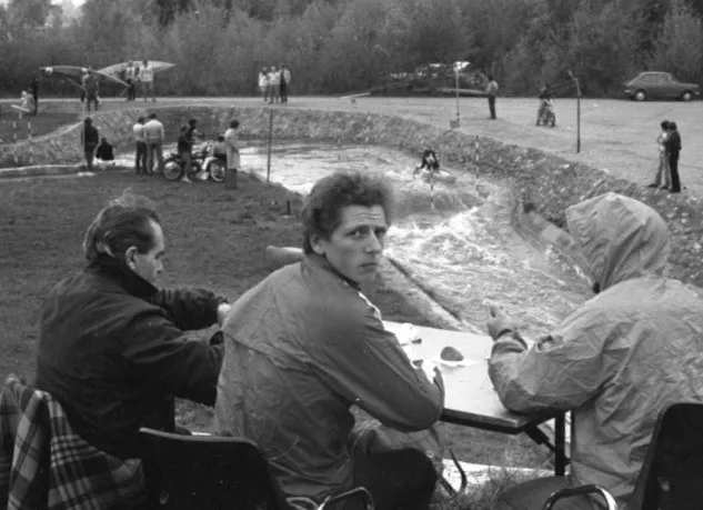 Après les JO de 1972, Jean Olry (à gauche) est nommé Directeur technique national, Eric Koechlin (au centre) à moins de 25 ans lui succède. Il portera le slalom français au plus haut niveau mondial. Interligue de slalom, octobre 1973, Vichy.