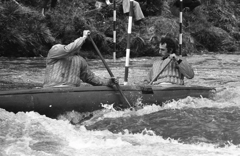 Après d’excellents championnats du monde 1971 (8 médailles dont 3 titres dans les 4 épreuves individuelles), les résultats des courses préolympiques des 21 et 22 juillet 1971 (2 médailles de bronze), sur le bassin des JO, préoccupent les dirigeants Allemands. Un constat, la connaissance du bassin sera un élément déterminant. Une décision immédiate : construire une réplique du bassin en Allemagne de l’Est. Werner Lampert, 34 ans directeur de l’équipe Allemande de l’est de slalom, se rend à Augsbourg. Il obtient un badge de visiteur du site, il mesure, dessine et photographie. Le chantier peut démarrer. Photo : Werner Lampert, au centre une feuille à la main, entouré de Reinhard Eiben et Siegbert Horn, champions olympiques 1972 en C1H et K1H. Augsbourg août 1972.