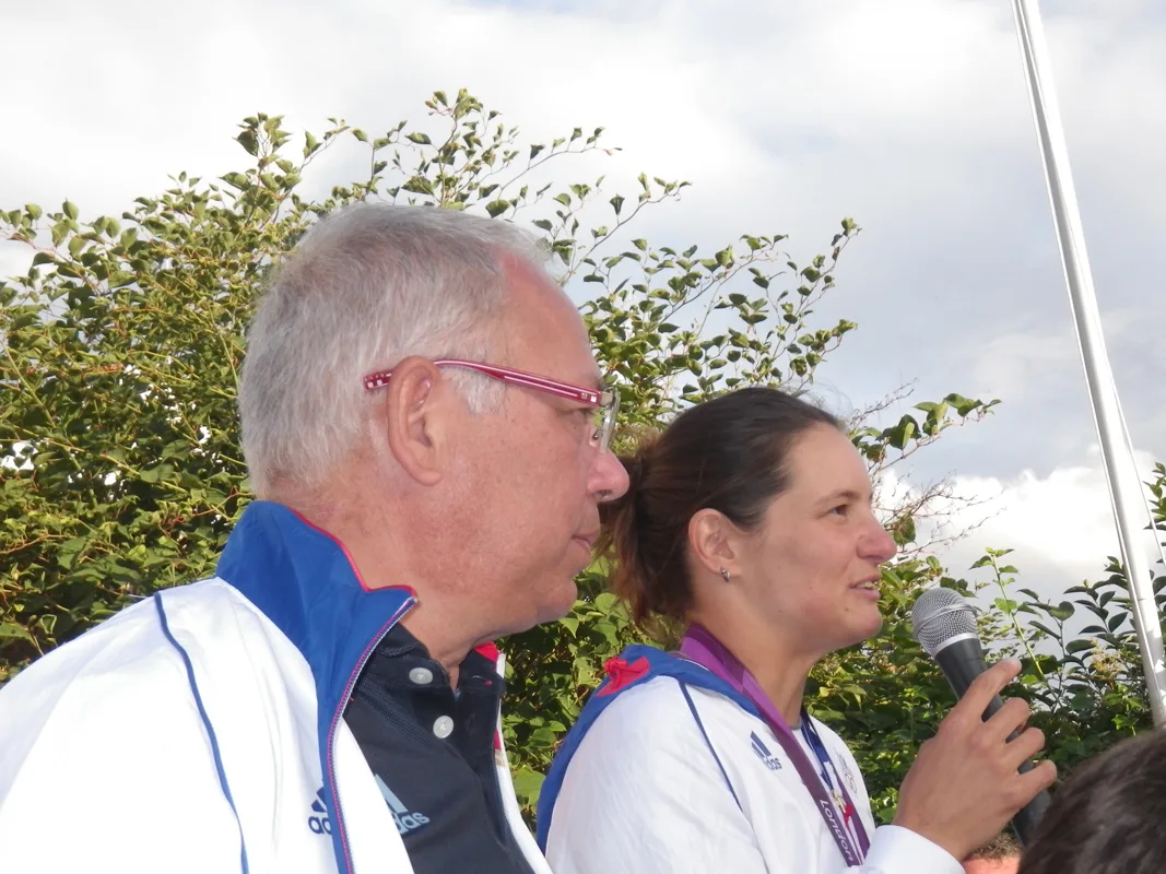 Accompagnée par Vincent Hohler, président de la FFCK, Émilie Fer remercie les supporters de la Tribu.